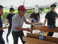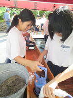 講師に春名先生・鳥居先生をお招きし、夏休みの前半に生徒たちが採取してきた砂鉄を昔ながらの比重差を利用した技法『鉄穴(かんな)流し』で不純物を取り除く作業をしました。
